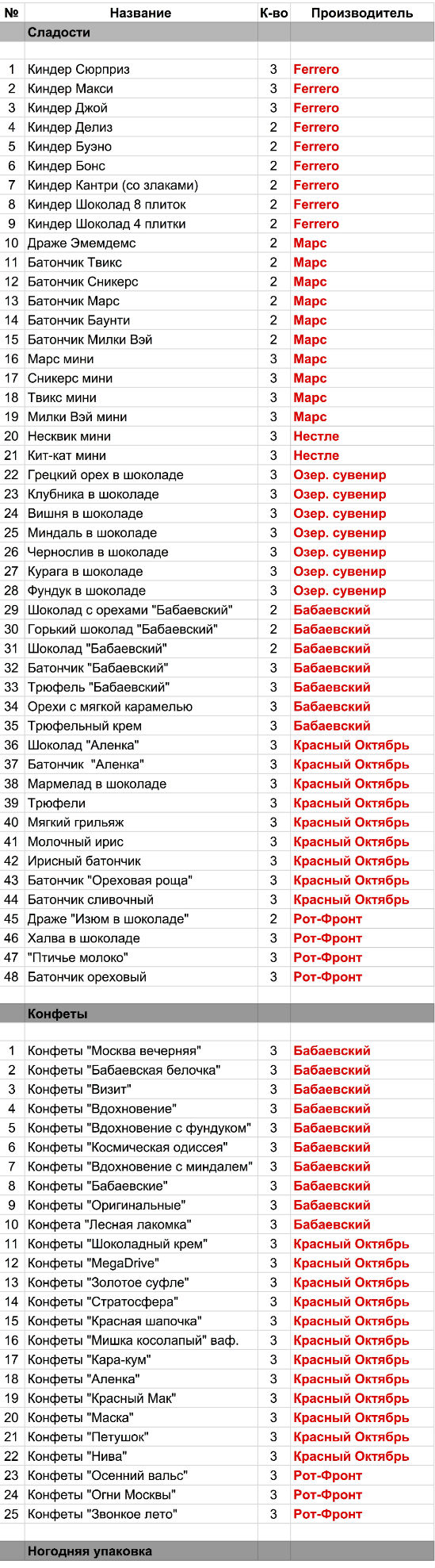 Молочный шоколад "Аленка" (3 шт), Батончик "Аленка" (3 шт), Мармелад в шоколаде (3 шт), Трюфели (3 шт), Мягкий грильяж (3 шт), Мягкий грильяж (3 шт),  Молочный ирис (3 шт), Ирисный батончик (3 шт), "Ореховая роща" (3 шт), Батончик сливочный (3 шт), Конфеты "Ну-ка отними !" (3 шт), Конфеты "Кара-кум" (3 шт), Конфеты "Красная шапочка" (3 шт), Конфеты "Мишка косолапый" (3 шт), Конфеты "Тоффи" (3 шт), Конфеты "MegaDrive" (3 шт), Конфеты "Аленка" (3 шт), Конфеты "Красный Мак" (3 шт), Конфеты "Маска" (3 шт), Конфеты "Петушок" (3 шт),  Конфеты "Нива" (3 шт)